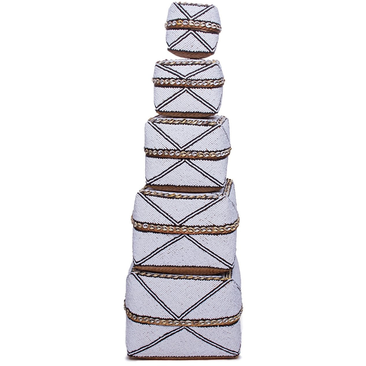these hand beaded baskets double as storage and objet that can live in just about any room from bathroom to office. the set of five baskets nest inside each other and can be displayed together or split up for use throughout the house.