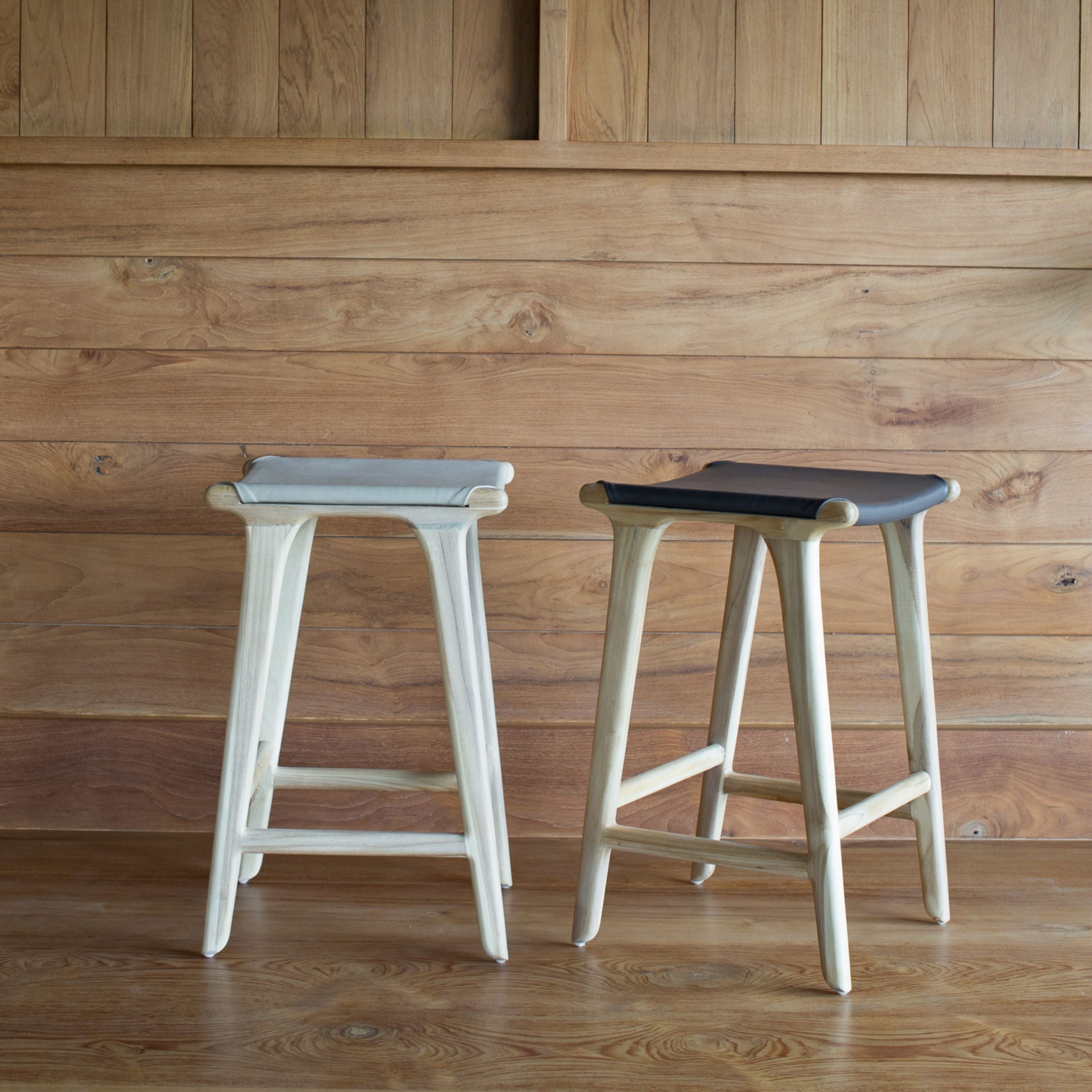 the nel is THE stool that your best friend will perch on to chat with you while you’re making dinner. with a hand-carved teak-wood frame and a calf-leather seat, she is both comfortable and casual - that perfect.